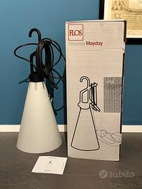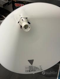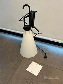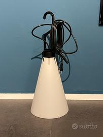 Gancio/maniglia, avente anche la funzione di avvolgicavo, e diffusore conico opalino stampati ad iniezione in polipropilene sostenibile ricavato da scarti del processo industriale. Interruttore a pulsante situato sulla maniglia.