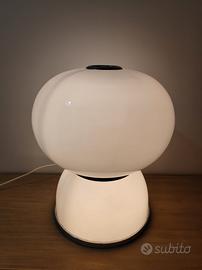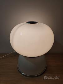 Design e Materiali: La lampada è caratterizzata da una base circolare in metallo cromato e da due semisfere in vetro opalino bianco che poggiano l'una sull'altra. Il design è tipico del modernariato italiano.