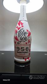 lampada-bottiglia santero realizzata artigianalmente forando il vetro ed assemblando l'impianto elettrico al suo interno., altezza cm 42 ,paralume tronco-conico avente diametro inferiore di cm 14 e superiore di cm 19,attacco con lampadina a LED G9