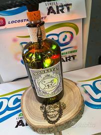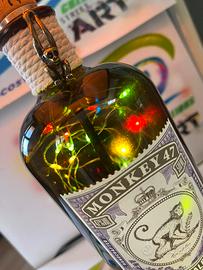 Lampada Bottiglia Gin Monkey 47 realizzata interamente a mano, unica nel suo genere per la lavorazione eseguita. Doppia illuminazione a led colorati nella bottiglia, lampadina e14. Paralume unico fatto a mano con stoffa in cotone. Ogni pezzo è unico: piccole differenze ne esaltano l’artigianalità e rendono ogni lampada speciale.