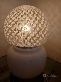 Vendo lampada composta da due elementi in vetro soffiato. La base è in vetro opaline (lattimo) bianco, mentre il diffusore superiore è un globo in vetro trasparente con un raffinato decoro a motivo floreale stilizzato (o a "nuvole") del filone Space Age e del design modernista italiano.
