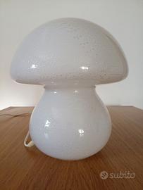 Murano Glass Mushroom Lamp lampada da tavolo / scrivana / abat jour in vetro di Murano Fungo lavorato a mano, vetro unico, bianco con scaglie argento Anni 70 Design Vintage Space Age Modernariato stile Venini / Vistosi (nessun marchio presente) altezza 28cm ca diametro max 23 ca attacco lampadina E14 in ottime condizioni, perfettamente funzionante venduta senza lampadina vista e piaiuta