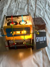 Pezzo di design industriale up-cycling realizzata con cassette audio vintage, fascette colorate e illuminazione interna.