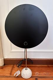 Lampada da tavolo con paralume circolare in alluminio che scherma l’emissione luminosa, creando l’effetto di un eclissi solare. Lo schermo circolare è verniciato bianco o nero, lo stelo e le minuterie metalliche sono cromati. La base è in metallo