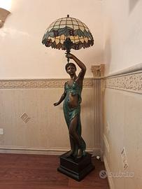 Un Capolavoro di Eleganza. Un vero e proprio pezzo d'arte che fonde la scultura classica con l'iconico design Art Nouveau. Perfetta per arricchire con un tocco di lusso e storia qualsiasi ambiente, da un salotto elegante a un ufficio di rappresentanza o come pezzo da collezione in una vetrina dedicata. Il fusto è rappresentato da una figura femminile dalle fattezze classiche, vestita con drappeggi fluenti. La scultura è realizzata in bronzo colorato (patinato), che le conferisce una ricca tonalità verde-smeraldo che esalta la tridimensionalità e l'espressione dinamica. La donna sorregge elegantemente il paralume, fungendo da cariatide luminosa. La statua poggia su una robusta base in stile corinzio, sopra un plinto scuro, che ne amplifica la presenza scenica. La sommità è coronata da un paralume in vetro artistico legato a piombo, chiaramente ispirato alla celebre tecnica Tiffany. Le vetrate sono decorate con motivi che ricordano grappoli d'uva e foglie, utilizzando vetri colorati e opalescenti che, una volta illuminati, creano un'atmosfera calda, accogliente e spettacolare. Le sue dimensioni importanti (cm 160 senza piedistallo e 202 con piedistallo corinzio) la rendono un punto focale imprescindibile in qualsiasi stanza. È la scelta ideale per chi cerca un'illuminazione d'ambiente con una forte personalità decorativa. Celebra l'unione tra l'arte della fusione del bronzo e la maestria vetraria, portando in casa un'eco del fasto dell'Art Nouveau e del primo Novecento. La cura per i dettagli nella scultura e l'integrità del paralume in vetro testimoniano la sua qualità superiore. Contattatemi al 335 7644991per maggiori dettagli. Non spedisco, è oneroso preparare un involucro sicuro per trasportatori TNT DHL ecc Meglio veniate a ritirarla o che ve la consegni io se abitate entro 30 km con l’aggiunta di un minimo contributo di € 60