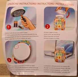 Vendesi lampada Nutella nuova e fuzionante compresa di istruzioni e scatola da imballo.Sul tappo si trova un pulsante touch per l’accensione e lo spegnimento delle 6 luci led. L’alimentazione avviene mediante batterie o con cavo micro USB.