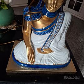 Buddha in porcellana dipinto a mano su una base con struttura in ottone. Paralume originale etichettato e ricoperto di seta.