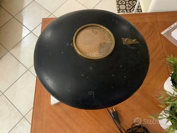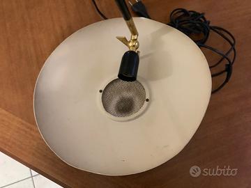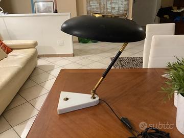 Ancora funzionante (vedi foto), un oggetto d’arredo unico, che, nonostante i suoi quasi 80 anni (anno di produzione 1950) sembra un oggetto di design attuale. La base è in marmo bianco, il braccio (orientabile) è in ottone e metallo laccato nero, così come la parte del “cappello”, che internamente è di colore panna. Il disco forato centrale (diffusore) è tipico nelle lampade anni ‘50 di qualità. Segni del tempo ben visibili in foto, ne incrementano il fascino del passato. Vista la particolarità e le condizioni della lampada, il prezzo non è trattabile, e ritiro a Taranto, non spedisco.