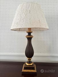 Lampada Ottocentesca. Legno noce. Rifiniture oro foglia, paralume pizzo bianco macramè foderato internamente. E27. Misure base h58 con paralume h78, ø44 paralume, base appoggio 18x18. Base €80 Paralume €60
