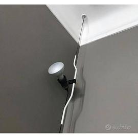 Questa lampada è la celebre Parentesi di Flos, un'icona assoluta del design industriale italiano. Concept Unico: Si tratta di una lampada a luce diretta che funge sia da sospensione che da terra. Il suo nome deriva dal tubolare in acciaio sagomato (a forma di parentesi) che scorre lungo un cavetto d'acciaio teso tra il soffitto e il pavimento. Regolabilità: Grazie alla frizione creata dalla forma del tubolare, il corpo illuminante può essere spostato verticalmente a qualsiasi altezza e ruotato di 360°, offrendo una flessibilità totale nell'orientamento della luce. Materiali: Realizzata con un cavo in acciaio, un tubolare in acciaio verniciato o nichelato e una testa in elastomero nero che alloggia l'interruttore. Dimensioni: Altezza massima circa 4 metri; diametro base 11 cm. Alimentazione: Si collega a una normale presa a muro, eliminando la necessità di un punto luce a soffitto. Versioni: Disponibile in versione standard con interruttore On/Off. Attacco Lampadina: E27 (tipicamente consigliata LED da 8W a 12W o alogena fino a 150W).