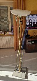 Lampada da terra in metallo con struttura intrecciata decorativa e base quadrata stabile. Paralume in vetro satinato che diffonde una luce morbida e calda, perfetta per soggiorno, salotto o camera da letto.
