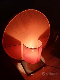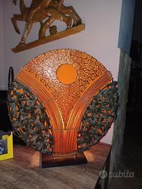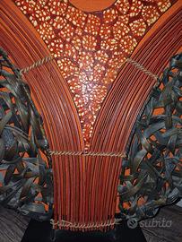 scenografica lampada etnica in rattan. il retro è in tessuto color arancio, il davanti come in foto rattan e credo sia un matriale simile a resina quello messo a mosaico arancio e bianco e fili di palma. unico impercettibile " danno" è evidenziato nella foto n° 5. diametro 50 . base h 4 cm.