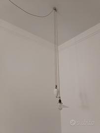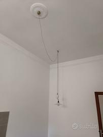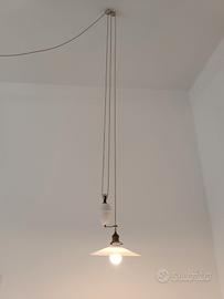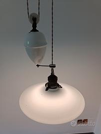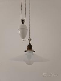 Antica lampada in porcellana con meccanismo sali-scendi, piatto diametro 25 cm e pigna del contrappeso altezza 13 cm, lunghezza totale cavo intrecciato circa 6,5 m