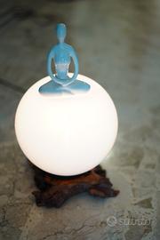ulivo moderna con design scultoreo. La è una sfera opaca bianca che diffonde una luce soffusa e rilassante, perfetta per creare un'atmosfera tranquilla. Sulla sommità della sfera è posizionata una piccola scultura stilizzata in ceramica bianca raffigurante una figura umana in posizione meditativa L'insieme evoca armonia e benessere, rendendola ideale per ambienti zen, studi yoga o spazi di relax contemporanei.