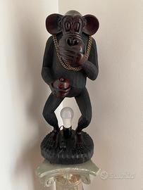 Rara e scenografica lampada da tavolo/terra raffigurante una scimmia nella posa classica del "non parlo". L'oggetto è un pezzo d'artigianato di alta qualità, interamente intagliato in un unico blocco di legno massiccio dalla splendida finitura scura e venature naturali a vista.