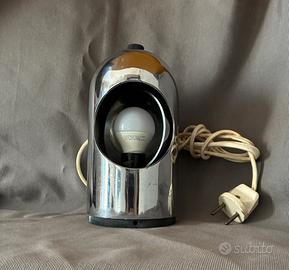 Caratterizzata da un design Space-Age tipico degli anni ’70. La scocca in metallo e la base in plastica, sono accompagnate da un dettaglio funzionale: una calotta interna sferica che può ruotare tramite una manopola superiore, consentendo di modulare il fascio luminoso a seconda dell’ambiente e dell’atmosfera desiderata. La lampada è in perfette condizioni ed è funzionante
