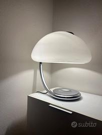 La lampada Serpente di Elio Martinelli (1965) è un’icona del design italiano. La sua linea sinuosa, che richiama il movimento di un serpente, si esprime attraverso il braccio curvo in metallo e il diffusore in metacrilato termoformato, orientabile per modulare la luce. Scultorea ed elegante, rappresenta un perfetto equilibrio tra forma e funzione, diventando un simbolo intramontabile del modernismo italiano.