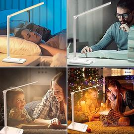 Protegge gli occhi: lampada da scrivania a LED senza sfarfallio e senza fastidiose ombre, crea una luce soffusa, previene l'affaticamento degli occhi causato da luce tremolante e abbagliamento. La lampada da scrivania è ideale per leggere e imparare a lungo. 50 livelli di luce regolabili. Lampada da tavolo con 10 livelli di luminosità e 5 modalità di illuminazione tra cui scegliere, lampada da tavolo che fornisce la luminosità ideale per lavorare, studiare, leggere e rilassarsi. Facile controllo tattile. Lampada da giorno con pratico sensore touch. Grazie alla funzione di memorizzazione, la modalità luminosa e cromatica impostata si riattiva automaticamente alla successiva accensione della lampada. Lampada da scrivania flessibile con braccio luminoso. È possibile ruotare il braccio della lampada fino a 225° e inclinarlo fino a 90°. Potete quindi scegliere il miglior angolo di illuminazione per soddisfare le diverse esigenze. Grazie allo stabilizzatore integrato nella base, il piedistallo della lampada da lettura rimane stabile quando viene impostata l'angolazione. Lampada da scrivania a lunga durata. Lampada da tavolo senza piombo o mercurio. Nessuna radiazione UV o IR. Dissipatore di calore in lega di alluminio, lampada da tavolo fino a 50.000 ore di durata, 40 volte più a lungo di una comune luce incandescente. -