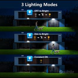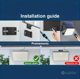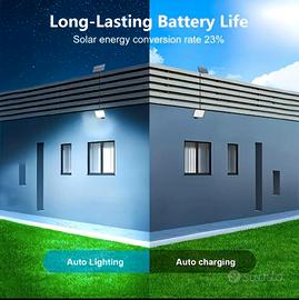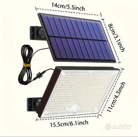 Componenti e Design: Design Split (Separato): Il pannello solare e l'unità luminosa sono separati e collegati da un cavo lungo 5 metri. Questo permette di posizionare il pannello solare nel punto con la migliore esposizione alla luce, anche se la lampada deve essere installata in una zona d'ombra o all'interno. 400 LED: La lampada è dotata di un elevato numero di LED (400), il che suggerisce una luminosità notevole. Pannello Solare ad Alta Efficienza: Viene indicata una percentuale di conversione dell'energia solare del 23%. Telecomando: Include un telecomando per l'accensione/spegnimento e la selezione delle modalità. Sensore di Movimento: Dispone di un sensore di movimento PIR per l'attivazione automatica. Staffa Regolabile: Sia il pannello che la lampada sono dotati di staffe che consentono una regolazione dell'angolazione per un posizionamento ottimale. Funzionalità e Modalità di Illuminazione: 3 Modalità di Illuminazione: Modalità 1: Luce spenta che si accende alla massima luminosità al rilevamento del movimento. Modalità 2: Luce fioca costante che passa alla massima luminosità al rilevamento del movimento. Modalità 3: Luce costante accesa a media luminosità (senza sensore di movimento). Automatica: La lampada si ricarica automaticamente di giorno e si accende di notte. Utilizzo e Installazione: Uso Versatile: Adatta per illuminare cortili, vialetti, giardini, scale esterne e anche aree interne come capannoni. Installazione Semplice: La guida all'installazione mostra come montare la staffa e collegare il cavo. È importante installare l'unità luminosa con il sensore rivolto verso il basso per un funzionamento corretto. Dimensioni: Pannello Solare: 14 cm x 8 cm Unità Luminosa: 15.5 cm x 11 cm Cavo di Collegamento: 5 metri