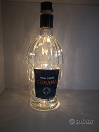 Vendo lampada composta da bottiglia trasparente a forma di banano di Cobana (liquore isole Canarie) convertita in lampada solare.