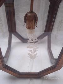 lampada a sospensione da Sagrestia anni 60, in legno, modello a 4 pannelli ottagonali con cornice a 2 gradoni interno cornice vetro trasparente con fiore centrale bianco satinato, parte superiore 4 barre arcate in ferro bronzato con foglie ed anello finale per appendere, lungo stelo porta lampada con rivestimento a foglie, perfettamente funzionante ( sono presenti segni di vecchia tarlatura,non più presenti è stata restaurata). misura pannelli 34 Z 24, altezza completa cm 53, interno cornice vetro 27 x 18.