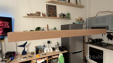 Vendo lampada dimmerabile in faggio lunga un metro con cavi elettrificati e sistema di carrucole,trasformatore da 200w, 80w di led luce calda, vetro satinato. Telecomando per dimmerare