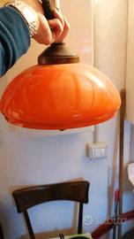 Lampada Neon. Diffusore in vetro arancione con tipica finitura tonda “mid‑century”, completo di parte superiore in metallo brunito e cavo spiralato estensibile, molto caratteristico delle produzioni italiane tra anni ’60 e ’70.