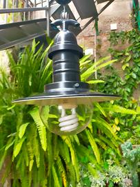Lampada a sospensione per esterni, in metallo resistente e design moderno-industriale.
