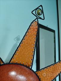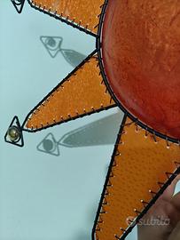 lampada spagnola con raggi in pelle e centro in resina. struttura in ferro. come nuova. altezza 72cm larghezza massima 50cm.