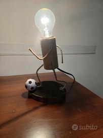 Lampada sport calcio, decorativa, come base una fetta di legno, come corpo cilindro di ferro rivestito con spago. Fatto a mano