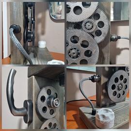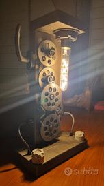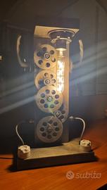 Lampada artigianale in stile steampunk. Ingranaggi in metallo rotanti, maniglie ruotabili a 360°. Legno massello spessore 35 mm, lampada 400 lumen, cavo lungo con spina. Altri componenti solo decorativi.