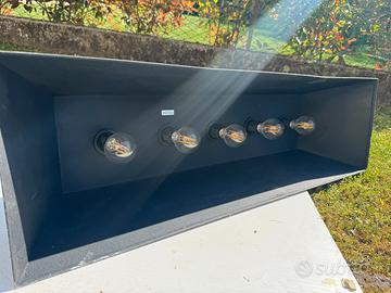 Vendo bellissima lampada da appendere a soffitto con impianto e catene per farla arrivare all’altezza desiderara. Dimensioni lampada: lato lungo 98 cm lato corto 29 cm, altezza catena 60/90cm Stile URBAN INDISTRIAL BLACK dal grande impatto scenico e un pezzo darredo molto d’impatto per cucine/sale da pranzo, ma anche negozi e locali. Ottimo effetto luminoso con le 5 lampadine a LED incluse. Pezzo UNICO! Diposnibile per consegna a mano in zona Desenzano del Garda o spedizione