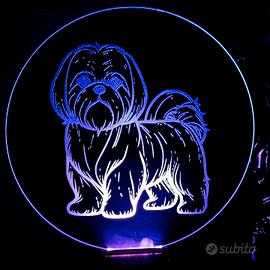 Bellissima lampada con incisione di un cane, realizzata su specchio, con base LED multicolor.