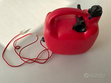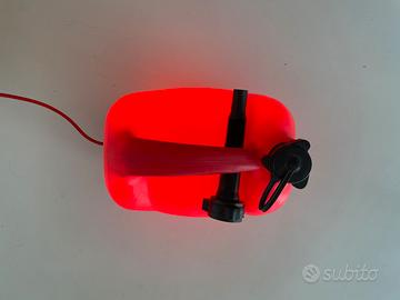 Tanica rossa in plastica con lapadina che diffonde una piacevole luce rossa.
