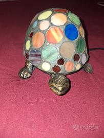 Splendida e particolare lampada a forma di tartaruga con base in pesante ottone, guscio realizzato saldando a stagno ogni singolo tassello in pasta di vetro. Realizzata a mano è un paralume in Stile Tiffany ideale in cameretta oppure all'ingresso di casa o come abat-jour.