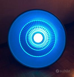 Lampada da terra/Tavolino luminoso - Industrial design Pezzo unico ideale per show room - eventi - taverne - locali atmosfera. Base alettata in ghisa nera, parabola in alluminio prismatizzato, vetro trasparente. Diametro 60 cm. Altezza 45 cm. Lampadina Led Smart Wi-Fi gestibile da APP per regolazione intensità/sfumature colori/temi luminosi predefiniti (RGB+CCT) o da telecomando compreso. Possibilità di creazione scenari personalizzati. Compatibile con controllo vocale Alexa/Google Home. Ritiro a carico acquirente. Prezzo € 380