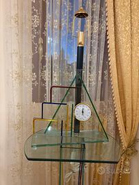 Design Iconico: Struttura architettonica in vetro massiccio di forte spessore, arricchita da elementi geometrici nei colori primari (giallo, blu, rosso) tipici dello stile di Ettore Sottsass e del design post-moderno italiano.
