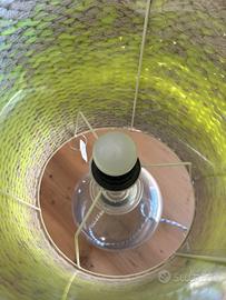 Lampada da tavolo con paralume in plastica rivestito in cotone tricot colo beige e verde fluo ,ancora con cartellino della marca, il piedistallo è un vaso in vetro trasparente che mostra all’interno la treccia elettrica,le misure sono:altezza totale 56cm,altezza vaso 34 cm,altezza paralume 29,larghezza paralume 28,5