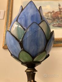 Lampada Tiffany con base in bronzo. Paralume realizzato con tecnica Tiffany in vetro cattedrale. Impianto nuovo con filo in tessuto, monta una lampadina E27. Si segnala la riparazione con resina di un vetro. Altezza cm 43, diametro paralume cm 13.