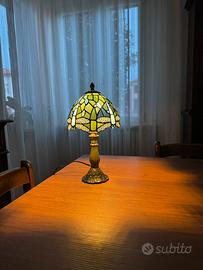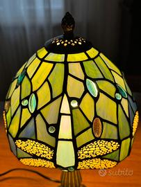 Elegante riproduzione della lampada Tiffany, realizzata a mano, curata nei minimi particolari, con paralume in vetro policromo, decorato da raffinati motivi di libellule.