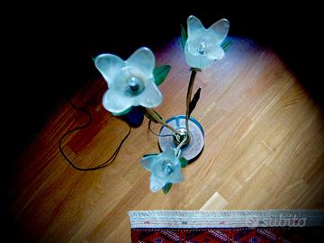 Una lampada elegante e raffinata con barra dimmer. È realizzata in metallo e ha un supporto circolare in vetro. Il colore della lampada è verdastro con una finitura artistica. I 3 fiori sono in vetro. Questa lampada è stata acquistata a Trieste 25 anni fa!