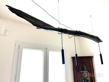 Lampada sospensione in legno di mare Venezia fatta a mano: lampada rustica a LED adatta a vari contesti e ambienti . Illuminazione sia verso l alto (tre barre led luce calda) sia verso il basso (3 fari sospesi led colore nero luce naturale).