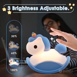 Vendo lampada in silicone unicorno a dondolo, 3 diversi livelli di luminosità, adatta per fare compagnia ai bimbi di notte o semplicemente per illuminare un po' la cameretta nelle ore più buie. Possibilità di impostazione timer, con spegnimento automatico.
