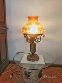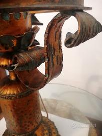 Elegante grande lampada in ferro antichizzato in color rame con sfumature verderame e patina originale prodotta da Longobard negli anni 70. La notevole struttura presenta finiture a sbalzo o martellata riproduzione fedele dello stile gotico medievale. Il paralume riccamente rifinito con segmenti di vetro color ambra e trasparente conferiscono bellissimi riflessi quando viene accesa.