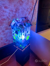 Lampada " realizzazione artigianale personale" in resina epossidica e vernice acrilica trasparente lucida, con base in legno, completa di cavo con interruttore, portalampada e lampadina color blu.