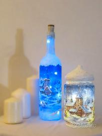 Vaso in vetro con villaggio di natale handmade e coperchio a forma di montagna, con effetto neve 3D. Abbinabile a bottiglia stesso stile, come da foto. Si può usare anche come piccola lampada per un migliore effetto Natale.