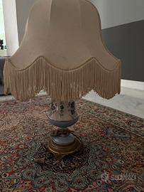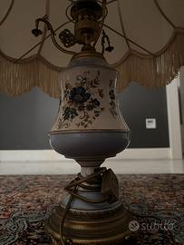 Vendo splendida lampada da tavolo (abat-jour) vintage, ideale per camera da letto o salotto in stile classico/retrò. Il corpo della lampada è in porcellana/ceramica bianca decorata con un delicato motivo floreale (bouquet di fiori blu e marroni). La struttura poggia su una solida base in metallo lavorato color ottone, con piedini a voluta.