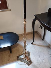 Bellissima lampada da terra vintage con fusto in legno e ottone, accensione delle 3 luci tramite pulsanti che comandano rispettivamente le due luci laterali e quella alta, indipendenti tra loro; inserti in pietra naturale onice grigio/verde e base in marmo 3, h.175 cm. paralume perfettamente integro . Visionabile a Milano.