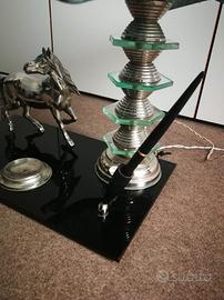 Vendo lampada vintage, originale in tutto . Base in vetro nero ,paralume in strisce di plastica blu su un portale in vetro e ferro, cavallo in metallo. Non spedisco.