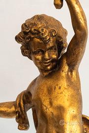 Lampada da tavolo decorativa con figura di putto in materiale pesante (gesso o resina) con finitura dorata e base in legno. Portalampada con vetro lavorato e impianto elettrico funzionante.Pezzo scenografico e d’impatto, ideale per ambienti classici o come arredo teatrale.